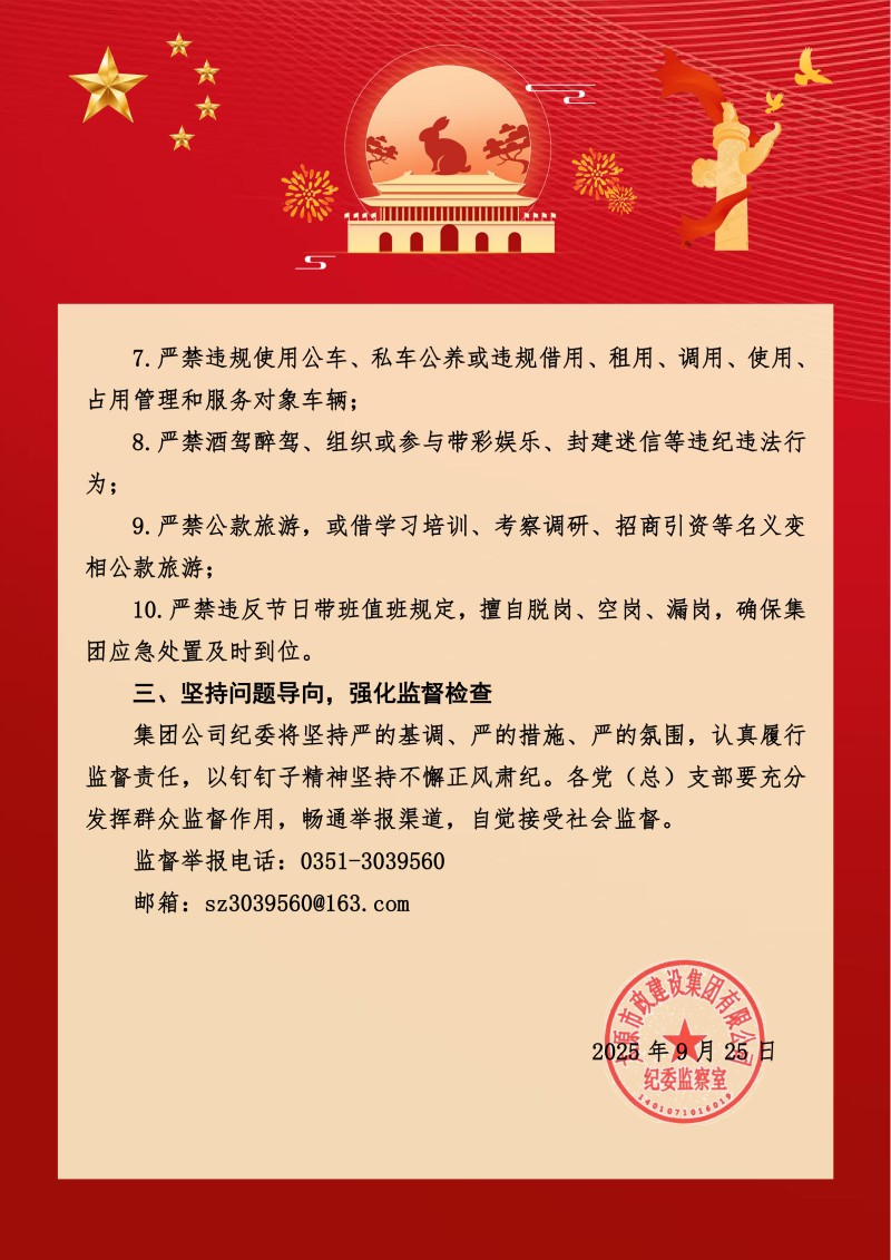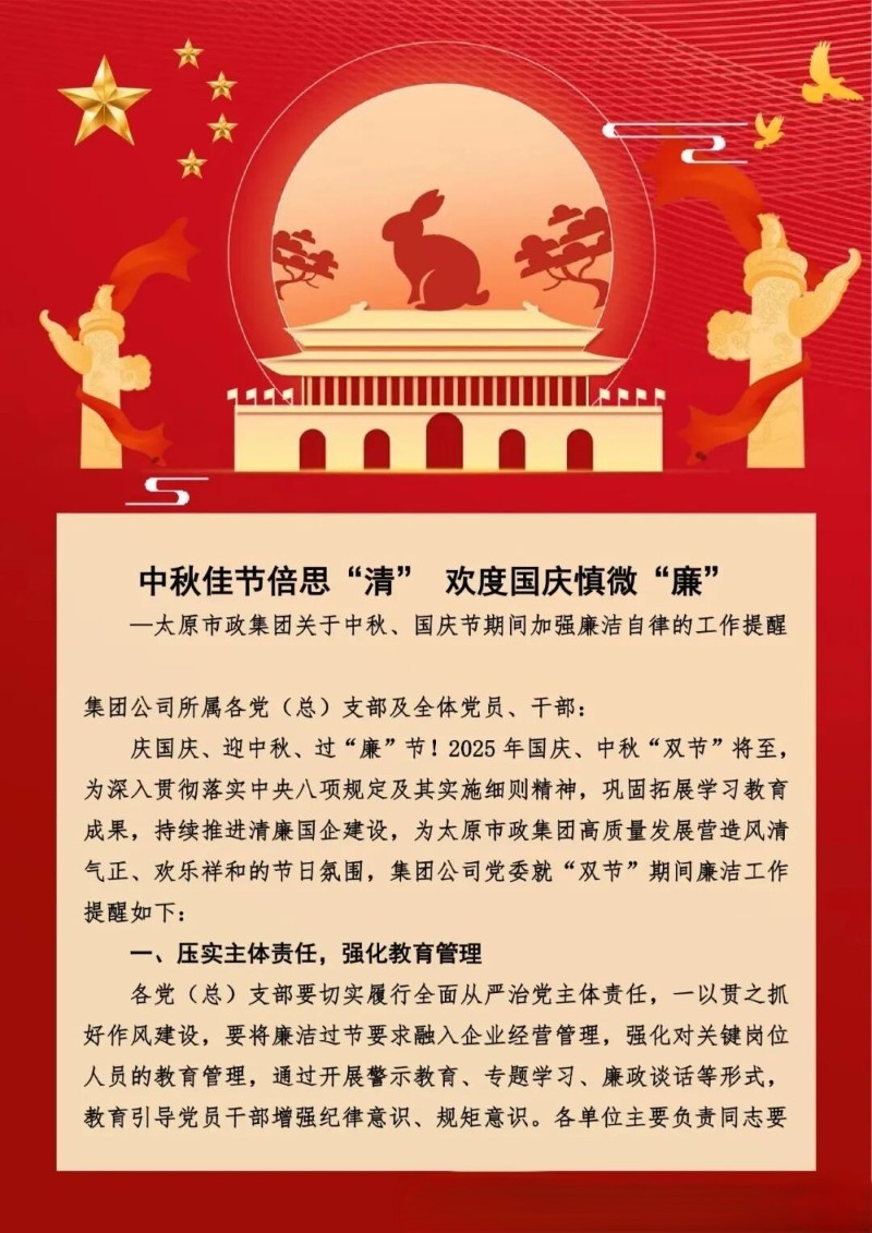 太原市政集團關(guān)于中秋、國慶節期間加強廉潔自律的工作提醒